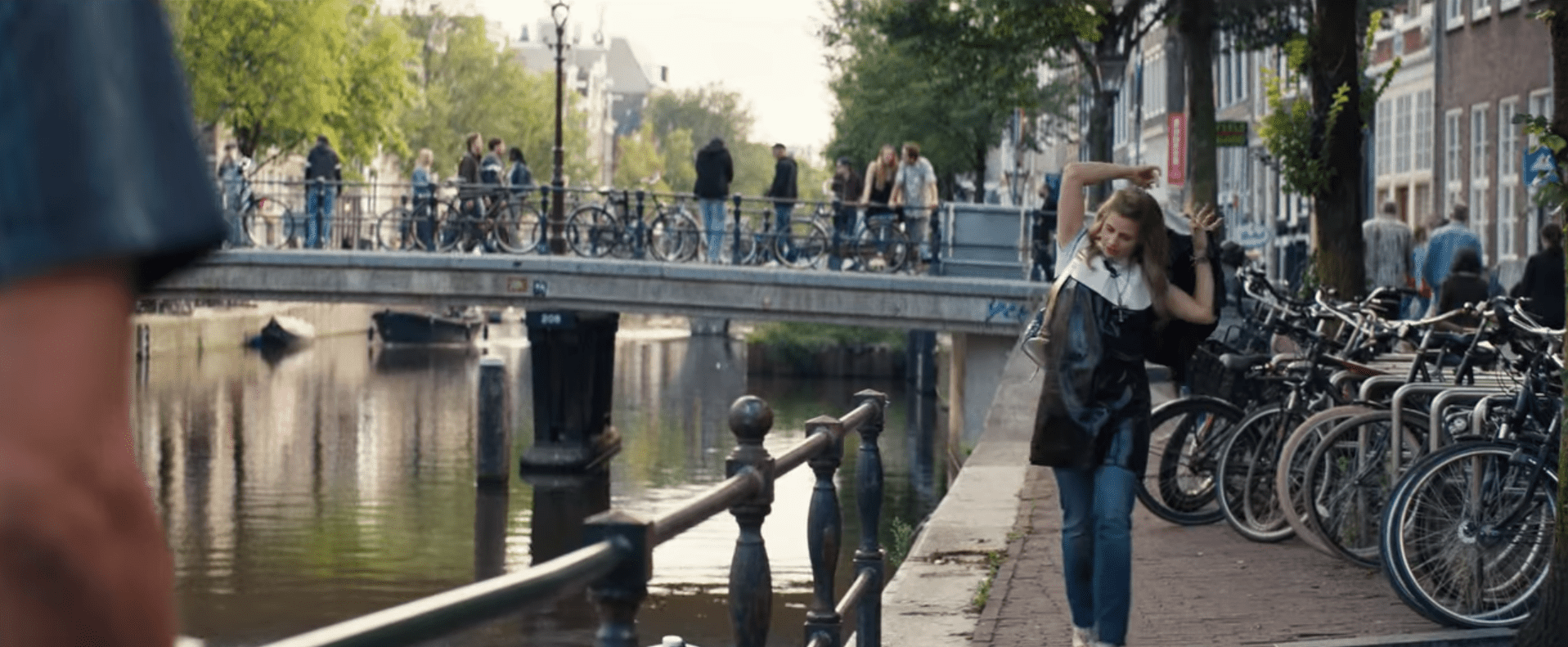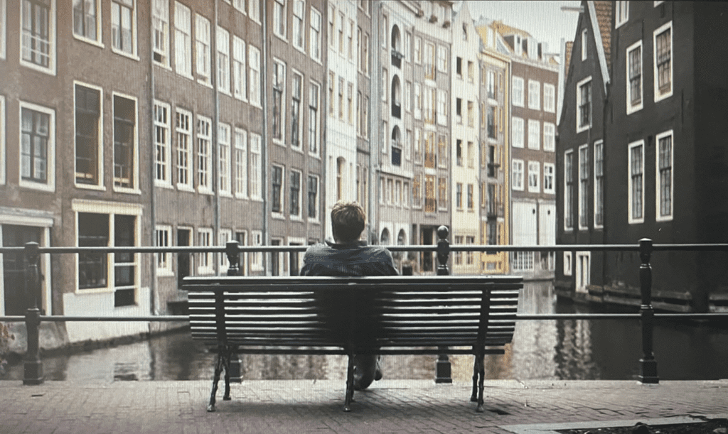 Ferry zit op een bankje in Amsterdam. Danielle heeft een vrijgezellenfeest in Amsterdam en ze zien elkaar.