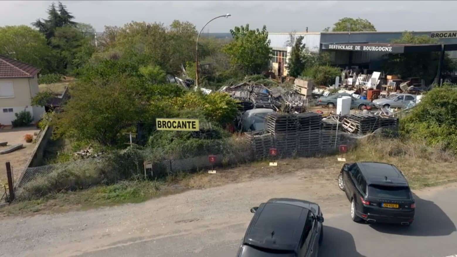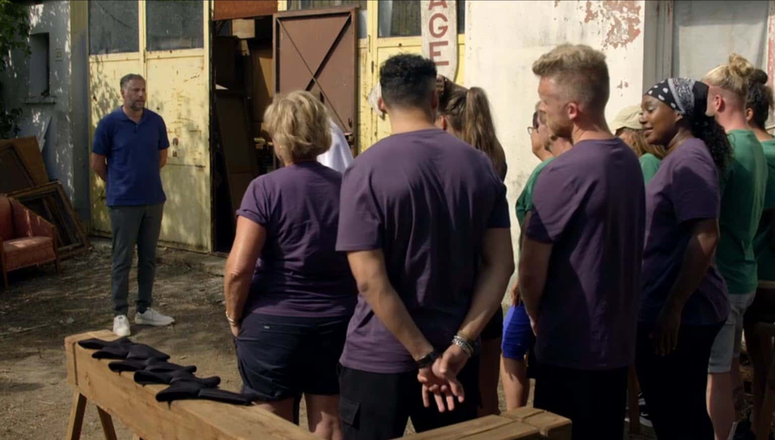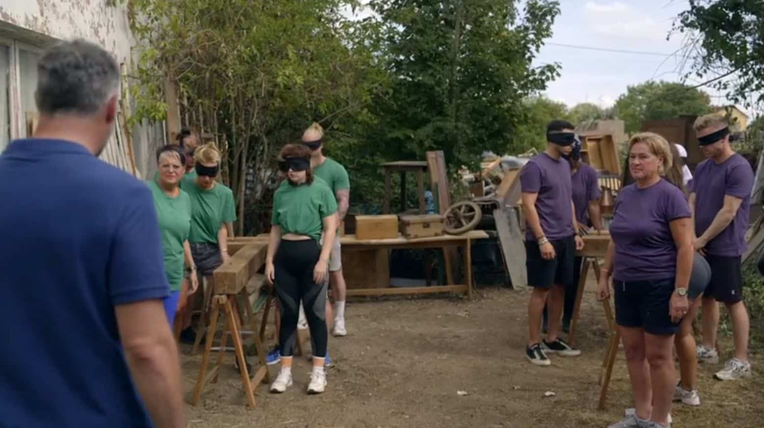 De deelnemers moeten in de brocante markt ene goot houten kruis, geblinddoekt en zonder iets te breken door een parcours brengen.