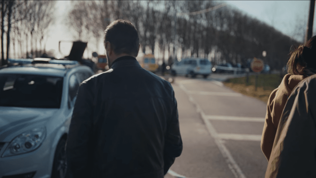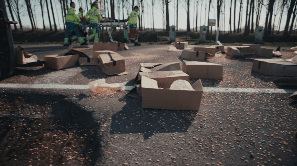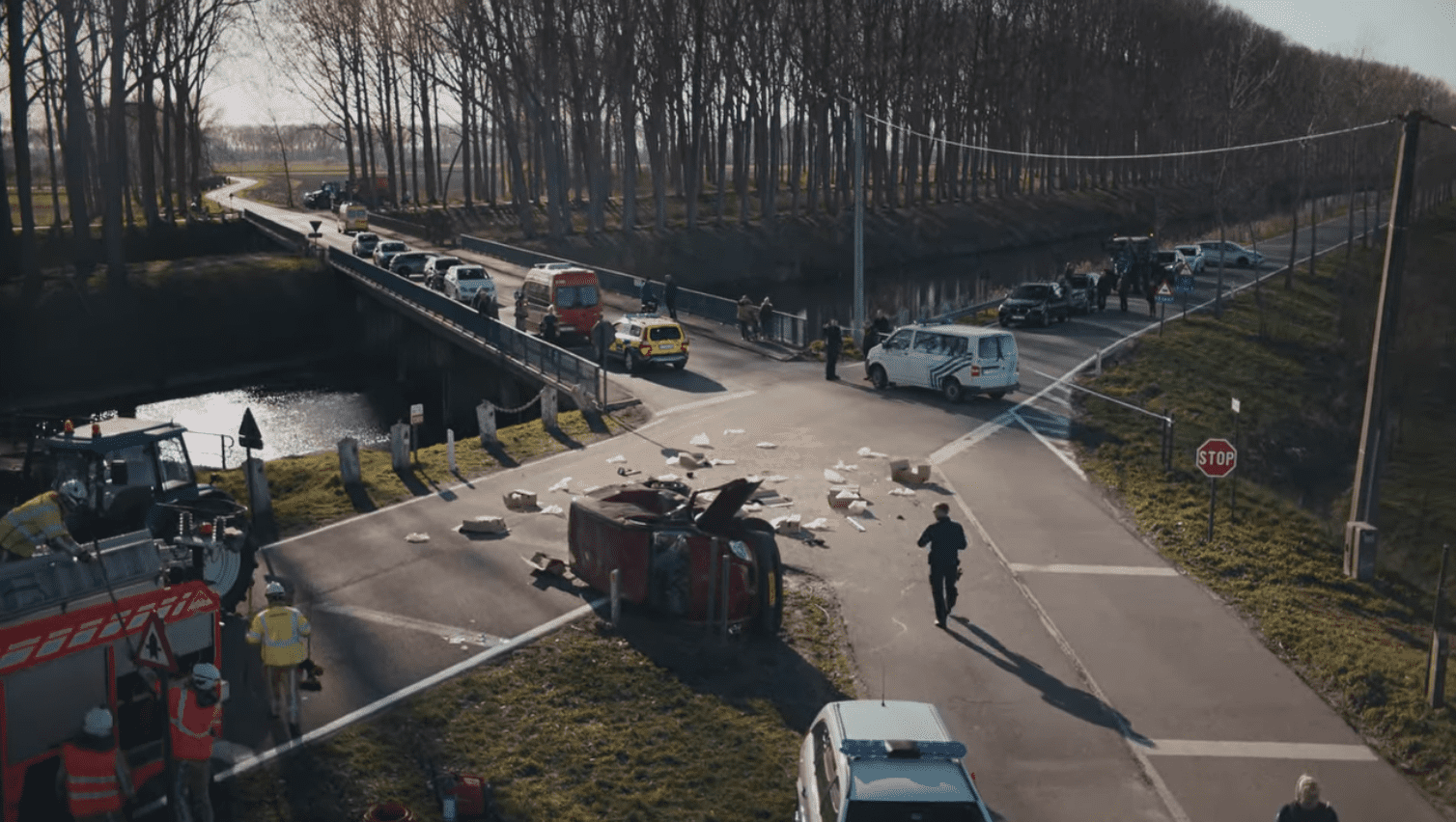 Tijdens de vlucht voor Bob wordt de auto van Lars en Ferry aangereden door een tractor.
