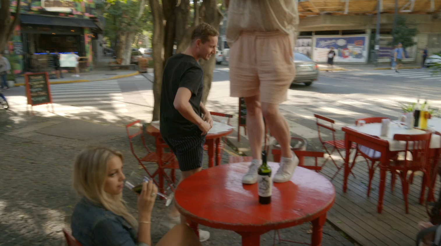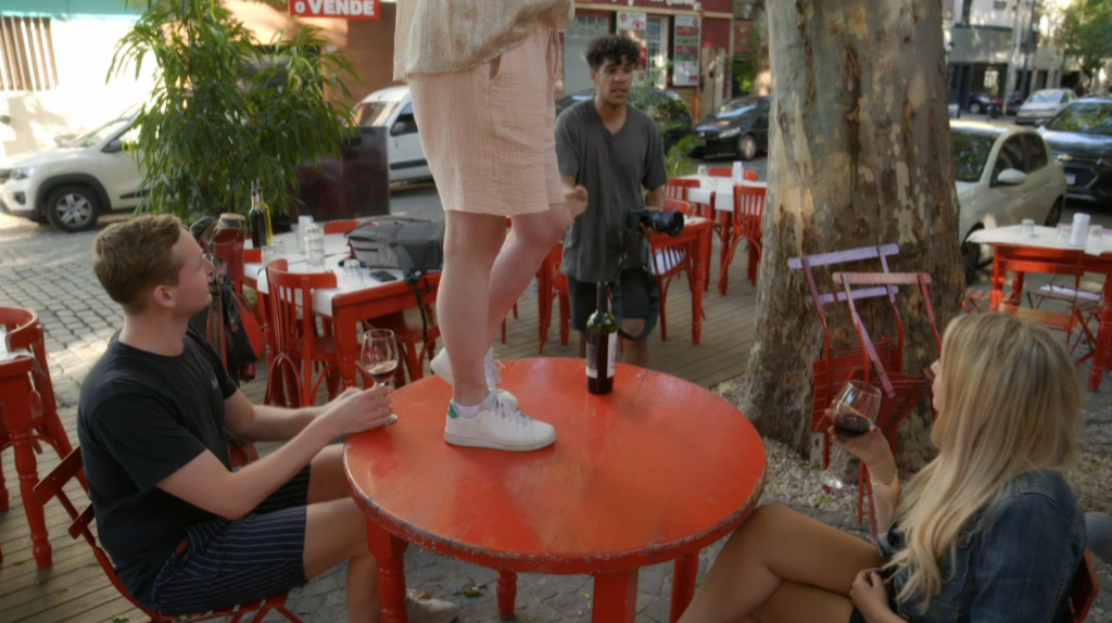 Maurice Lede legt Babette van Veen vast terwijl zij al golfend op een café tafel staat.