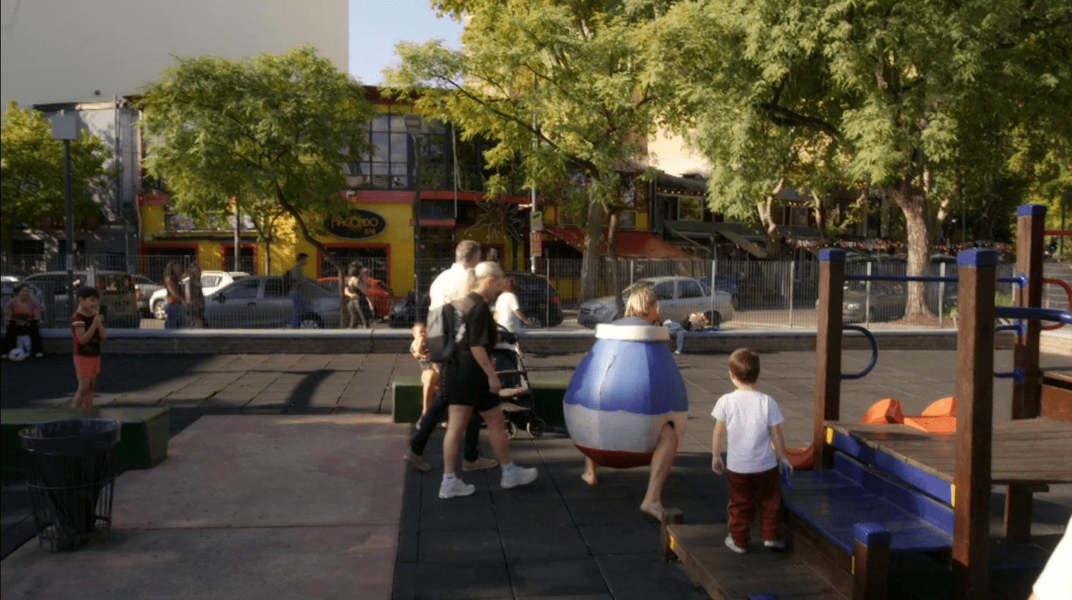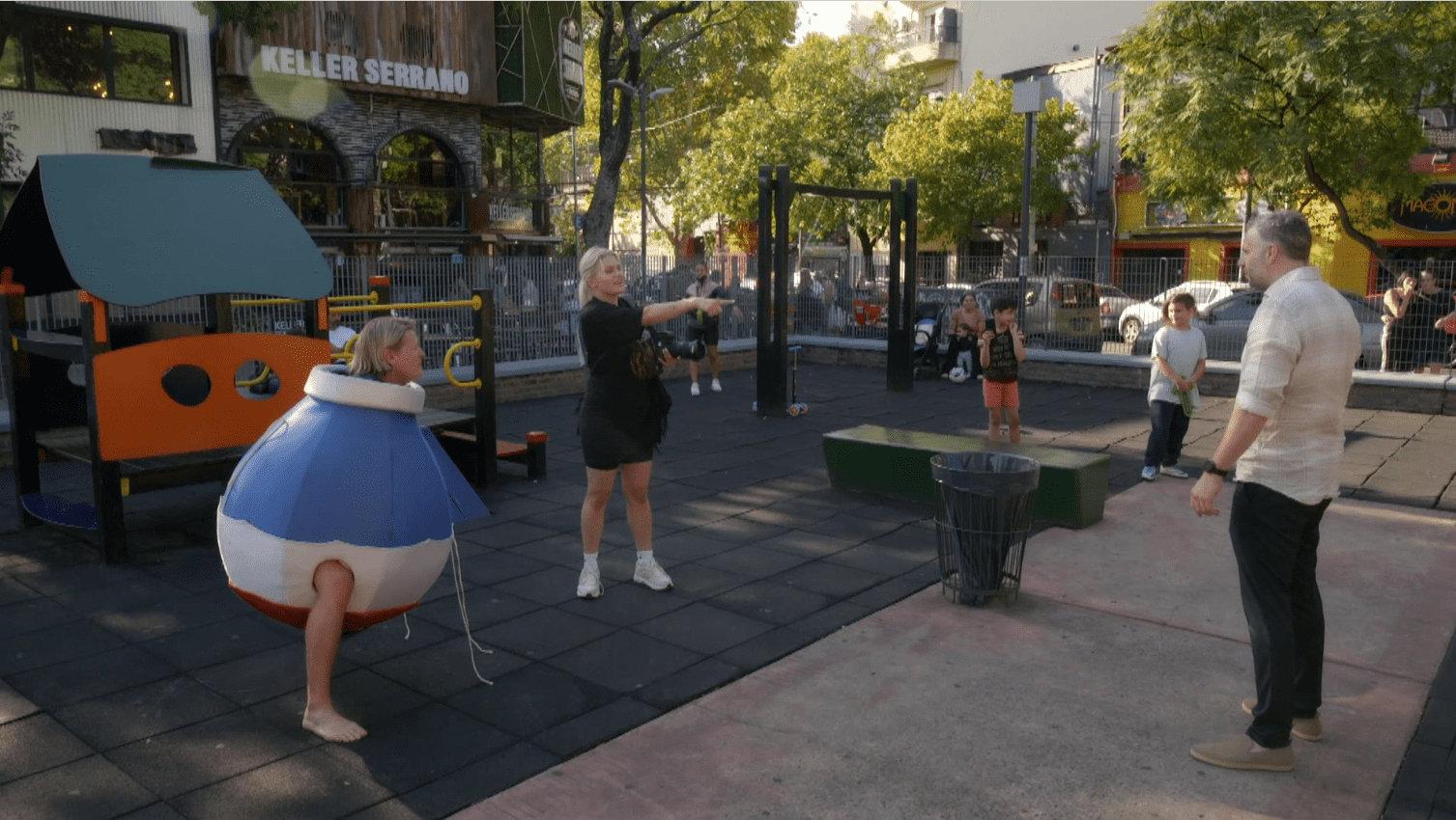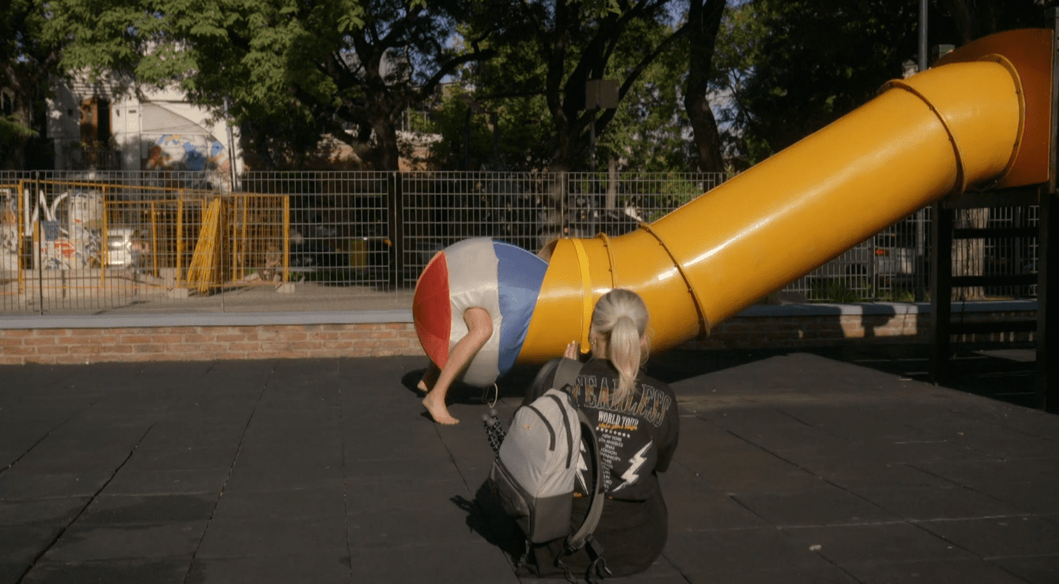 Roxanne Kwant legt Thomas Berge vast in een omgekeerde luchtballon onder aan een glijbaan.