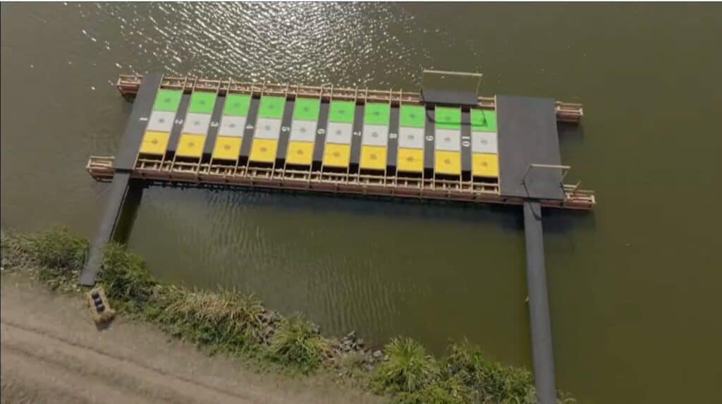 De deelnemers moeten met de handen gekruist op één van de drie vlakken springen. 2 van de drie vlaken laten je in het water vallen, maar één vlak is stevig. Door het verzamelen van hints onderweg naar de spellocatie moesten Kim en Roderick de veilige vlakken onthouden.