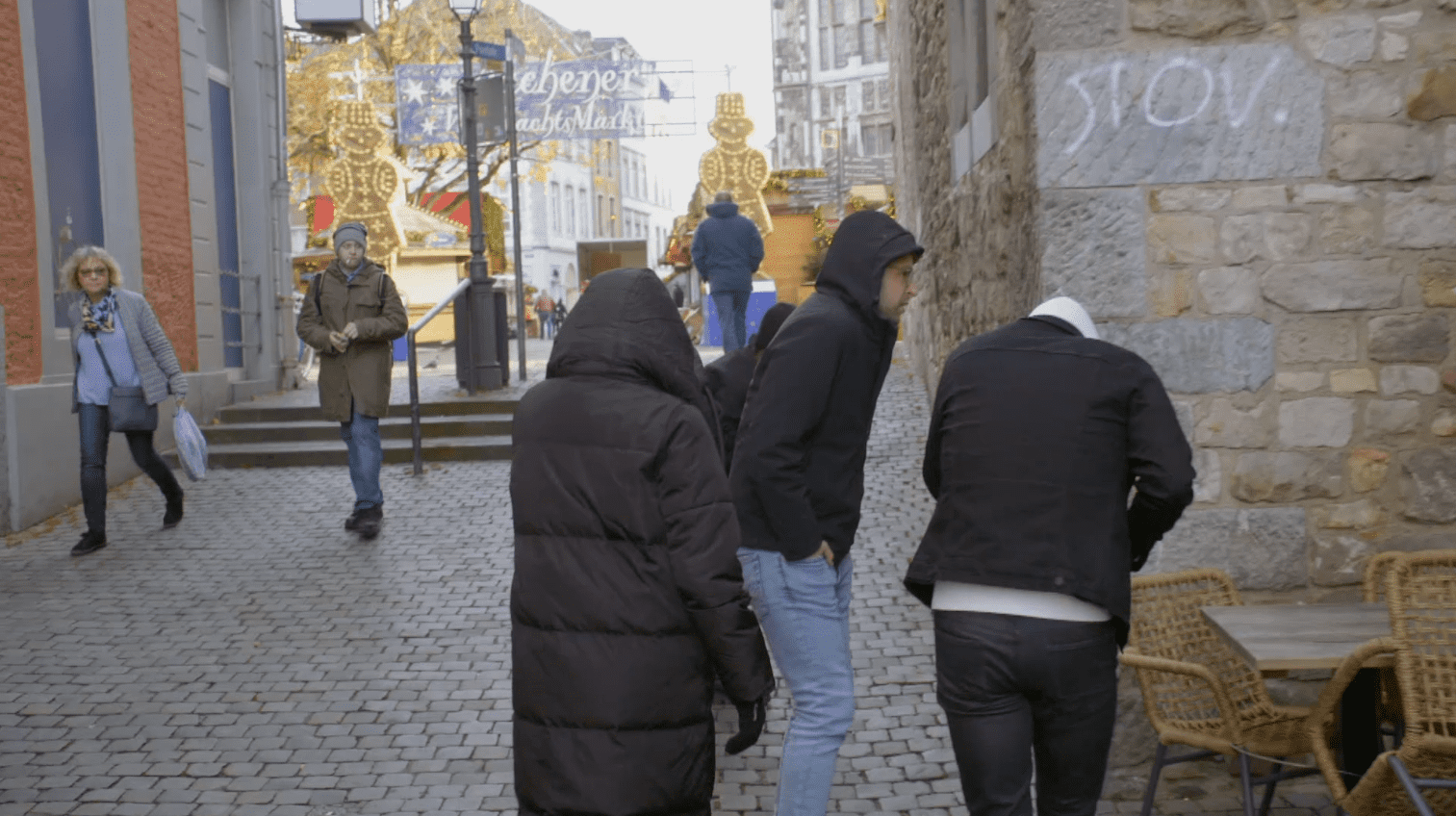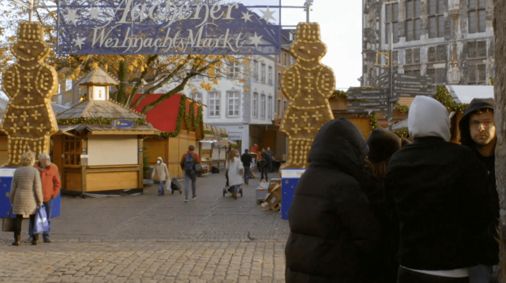 Het team Toine, Robbie, Sylvia en Caroline houd zich schuil bij Markt in Aachen.